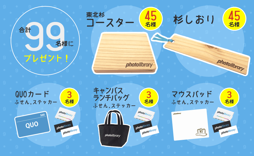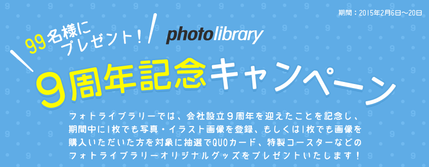2015/02/26 Category : 写真素材【フォトライブラリー】 写真素材フォトライブラリー・9周年記念キャンペーン 2015/2/6 ~ 2015/2/20までということで、気付いた時は終わっていました、残念。なかなかのオリジナル商品感があり、興味が湧きます。ちなみにコースターが欲しかったです。。写真素材フォトライブラリーhttp://www.photolibrary.jp/ [0回]